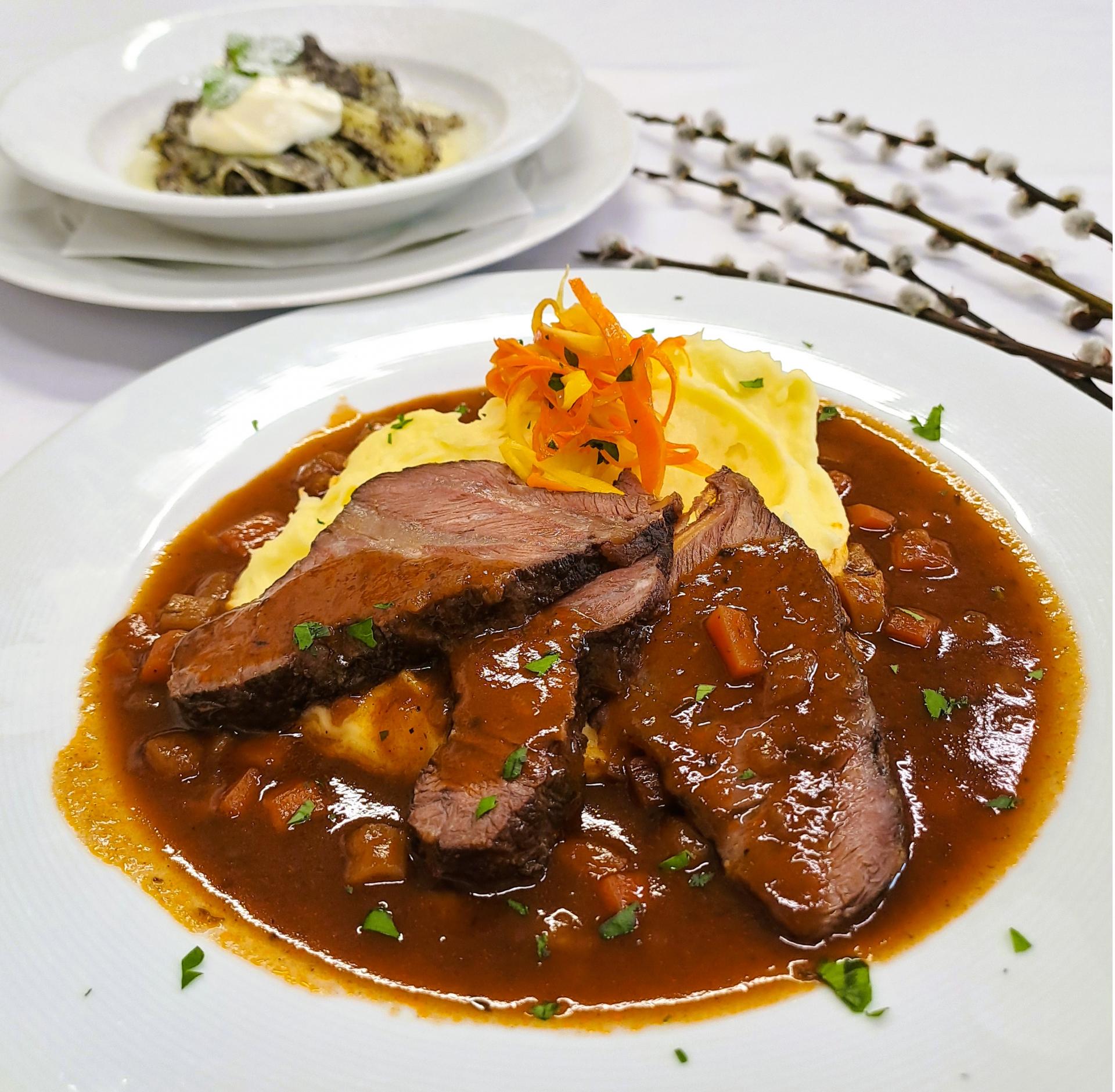 Dnes, 26.03. 2026, Vás na denním menu čeká: Hovězí líčka na červeném víně s bramborovou kaší a Nudle s...