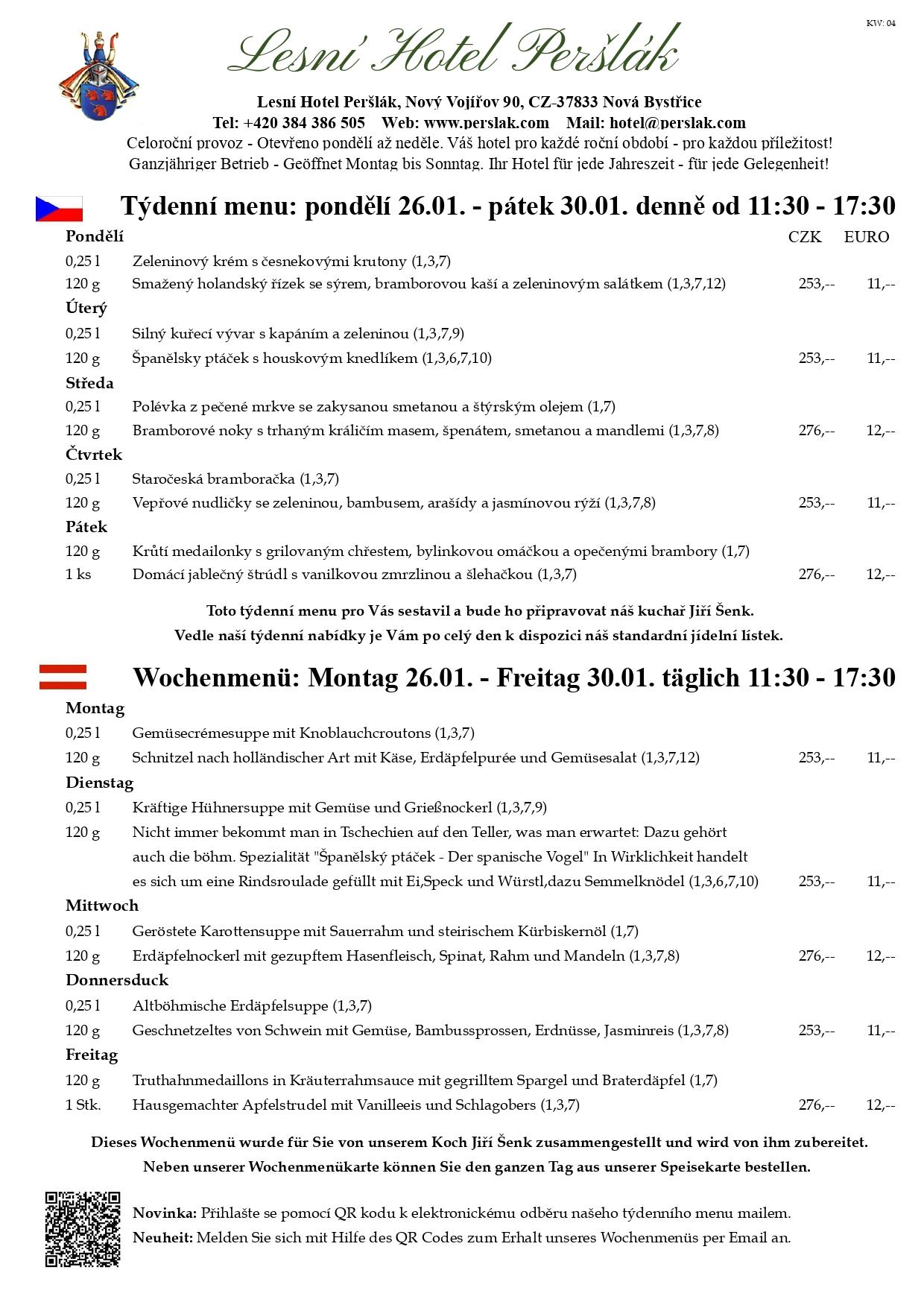 Dnes, 20.01. 2026, Vás na denním menu čeká: Pórková polévka s vejcem a Krůtí prsíčko na paprice s...