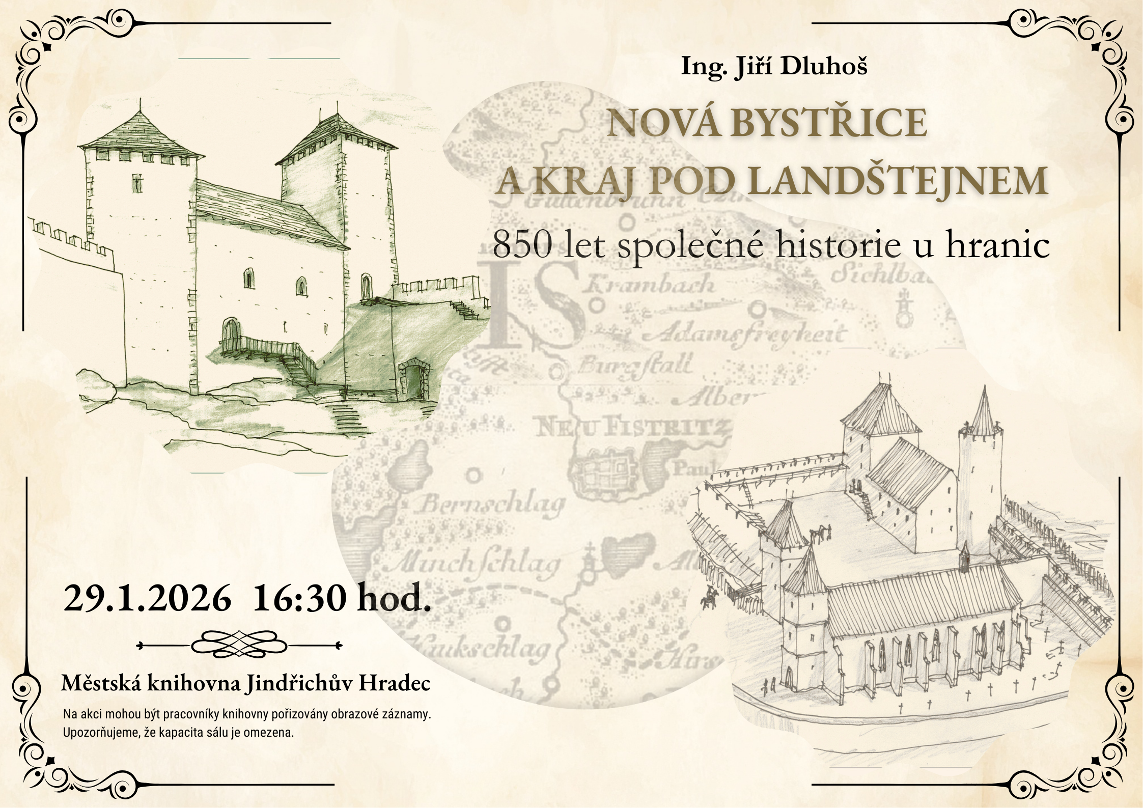 | 29. 1. | Čtvrtek | 16:30 | Přednáška: Nová Bystřice a kraj pod Landštejnem: 850 let společné historie u hranic s Ing. Jiřím Dluhošem v Městské knihovně v Jindřichově Hradci; více na Nová Bystřice a kraj pod Landštejnem |