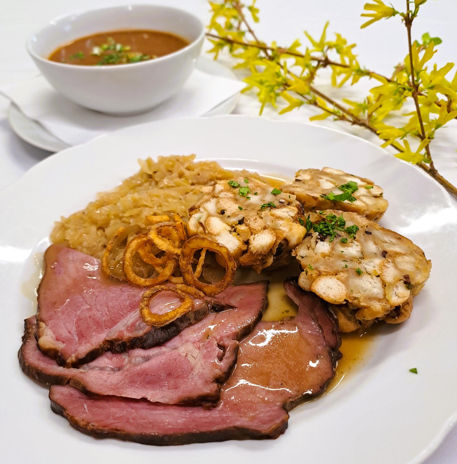 Dnes, 10.04. 2026, Vás na denním menu čeká: Pečená vepřová krkovice na kmíně a česneku se zelím a bramb....