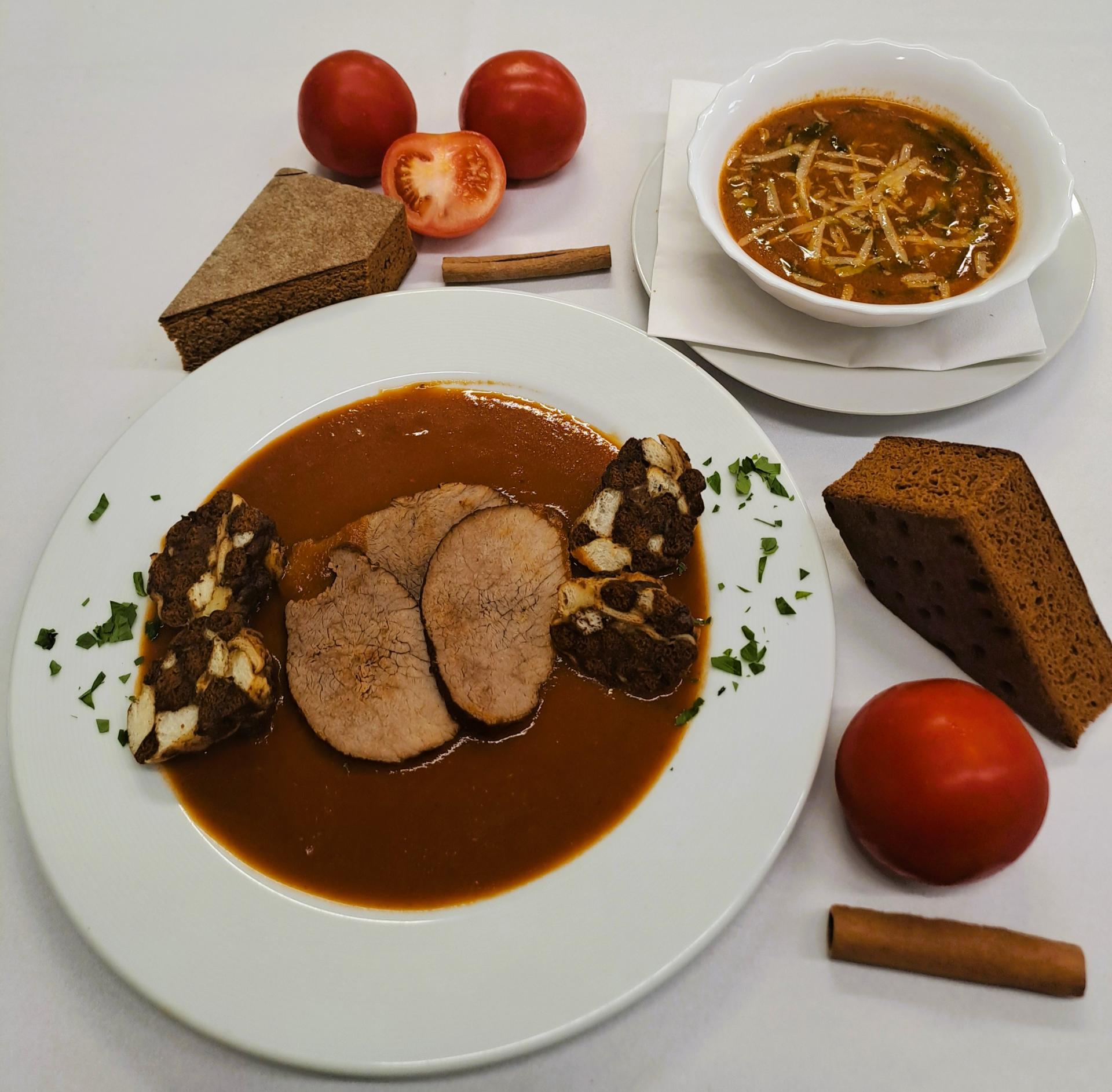 Dnes, 25. 11. 2025, Vás na denním menu čeká: Silný hovězí vývar s šunkovým svítkem a Uzená krkovice se...